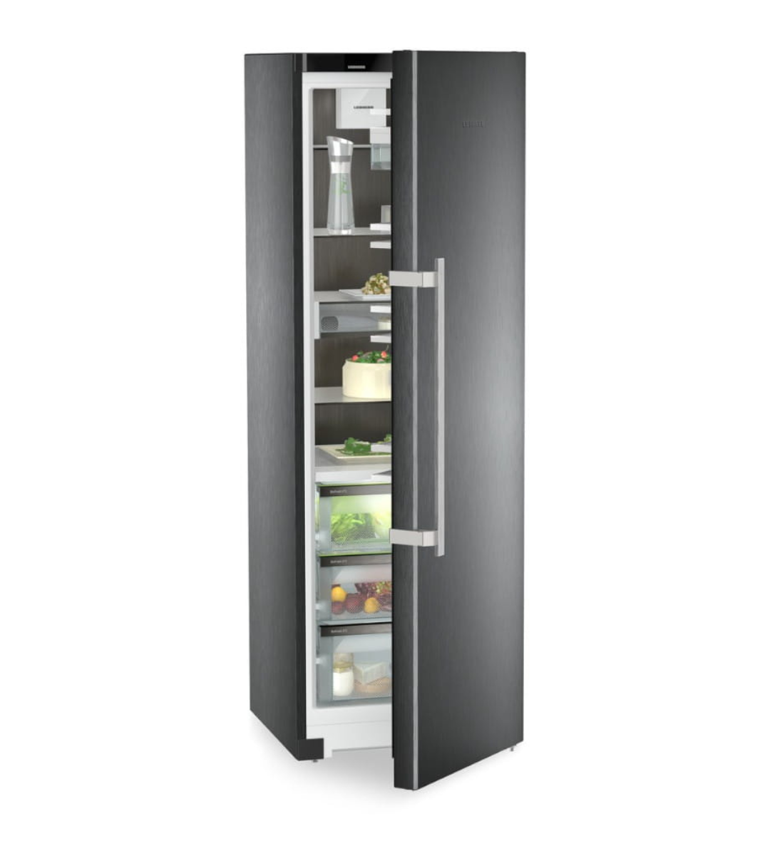 Chłodziarka Liebherr RBbsb 525i łączy technologię BioFresh, system PowerCooling z filtrem FreshAir oraz eleganckie wykończenie BlackSteel. Pojemność całkowita 386 l, trzy szuflady BioFresh z prowadnicami SoftTelescopic oraz kolorowy wyświetlacz TFT 2,4″ z funkcją Touch & Swipe zapewniają precyzyjne przechowywanie żywności i intuicyjną obsługę. Zintegrowany moduł SmartDeviceBox umożliwia połączenie urządzenia z siecią WLAN.