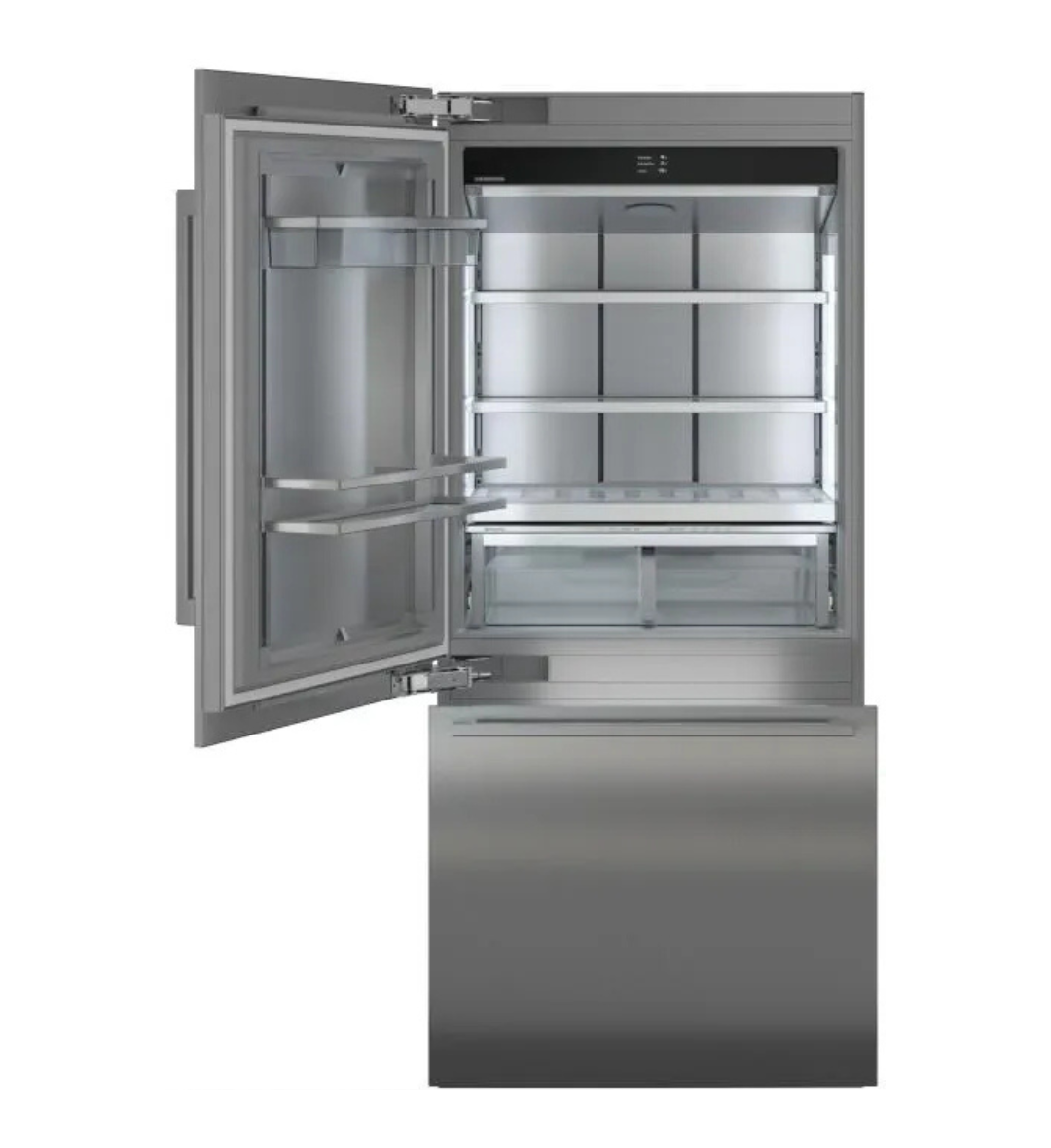 Chłodziarko-zamrażarka do zabudowy Liebherr Monolith ECBNdi 9971 z serii LargeDoor łączy technologię DuoCooling, system BioFresh-Plus oraz NoFrost z modułem SmartDeviceBox w standardzie. Model o szerokości 90 cm oferuje trzy strefy temperaturowe, zintegrowany dystrybutor wody InfinitySpring, automatyczny IceMaker z funkcją MaxIce oraz sprężarkę VCC 4-Speed zapewniającą wydajną i energooszczędną pracę.
